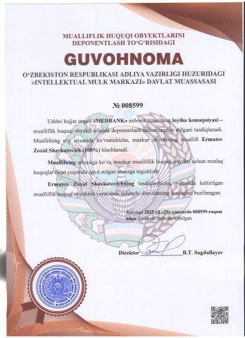 739 | №008599 | Loyiha konsepsiyasi – "MEDBANK" | Ermatov Zoxid Shavkatovich (100%) | Ermatov Zoxid Shavkatovich | 01/29/2025 | ![]() |