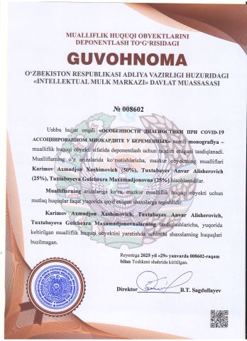 736 | №008602 | Monografiya –"ОСОБЕННОСТИ ДИАГНОСТИКИ ПРИ COVID-19 АССОЦИИРОВАННОМ МИОКАРДИТЕ У БЕРЕМЕННЫХ" | Karimov Axmadjon Xashimovich (50%), Tuxtabayev Anvar Alisherovich (25%), Tuxtabayeva Gulchexra Maxamadjonovna (25%) | Karimov Axmadjon Xashimovich, Tuxtabayev Anvar Alisherovich, Tuxtabayeva Gulchexra Maxamadjonovna | 01/29/2025 | ![]() |