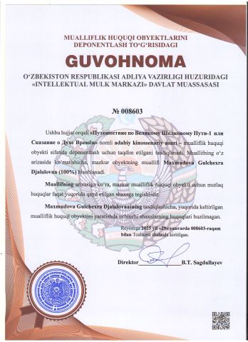 735 | №008603 | Adabiy kinossenariy asari – "Путешествие по Великому Шелковому Пути-1 или Сказание о Духе Времён" | Maxmudova Gulchexra Djalalovna (100%) | Maxmudova Gulchexra Djalalovna | 01/29/2025 | ![]() |
