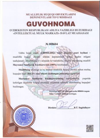 734 | №008604 | Ssenariy asari loyihasi – "CHIMILDIQ" | Mayramov Saidkarim Kuchkarovich (100%) | «BIZ-TV» mas’uliyati cheklangan jamiyati | 01/29/2025 | ![]() |