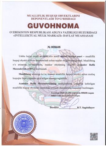 730 | №008608 | Matnli musiqa asari – "O‘RGILAY" | Axmedov Rafik Maxsudovich (100%) | Axmedov Rafik Maxsudovich | 01/29/2025 | ![]() |
