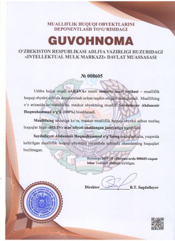 733 | №008605 | Ssenariy asari loyihasi – "ARAVA" | Saydullayev Abdunosir Haqmuhammad o‘g‘li (100%) | «BIZ-TV» mas’uliyati cheklangan jamiyati | 01/29/2025 | ![]() |