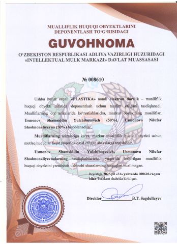 728 | №008610 | Elektron darslik – "PLASTIKA" | Usmonov Shamsiddin Yulchiboyevich (50%), Usmonova Nilufar Shodmonaliyevna (50%) | Usmonov Shamsiddin Yulchiboyevich, Usmonova Nilufar Shodmonaliyevna | 01/31/2025 | ![]() |