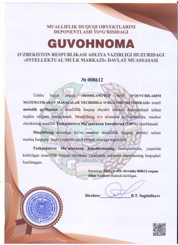 726 | №008612 | Metodik qo‘llanma– "BOSHLANG‘ICH SINF O‘QUVCHILARINI MATEMATIKADAN MASALALAR YECHISHGA O‘RGATISH METODIKASI" | Toshpulatova Ma’muraxon Ismoilovna (100%) | Toshpulatova Ma’muraxon Ismoilovna | 02/03/2025 | ![]() |