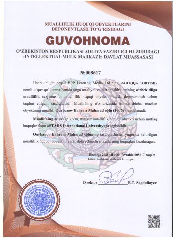 721 | №008617 | O‘zbek tiliga mualliflik tarjimasi – "SOLIQQA TORTISH" | Qurbanov Bahram Mahmud oğlu (100%) | STARS International University | 02/06/2025 | ![]() |