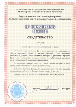 | 7460 | №002728 | Научная статья – "Некоторые вопросы доследственной проверки в уголовном процессе Республики Узбекистан" | Хидоятов Бахтияр Батирович (100%) | Хидоятов Бахтияр Батирович | 12/04/2020 | ![]() |