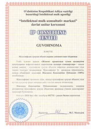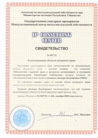 | 7456 | №002732 | Илмий мақола - "Жиноят процессида гумон қилинувчи ҳуқуқларини кафолатлашга қаратилган халқаро стандартлар" | Мавланов Камолиддин Тўйчиевич (100%) | Мавланов Камолиддин Тўйчиевич | 12/04/2020 | ![]() |