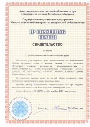 | 7458 | №002730 | Научная статья – "Судебный порядок размещения несовершеннолетних в специализированные учебно-воспитательные учреждения" | Суюнова Дилбар Жолдасбаевна (100%) | Суюнова Дилбар Жолдасбаевна | 12/04/2020 | ![]() |