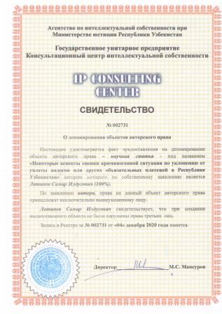 | 7457 | №002731 | Научная статья – "Некоторые аспекты оценки криминогенной ситуации по уклонению от уплаты налогов или других объязательных платежей в Республике Узбекистан" | Латипов Самир Илдусович (100%) | Латипов Самир Илдусович | 12/04/2020 | ![]() |