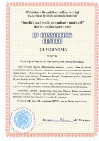 | 7450 | №002738 | Ўқув қўлланма - "Психологик хизмат" | Нишанова Замира Таскараевна (50%), Расулова Феруза Файзуллаевна (50%) | Нишанова Замира Таскараевна, Расулова Феруза Файзуллаевна | 12/04/2020 | ![]() |