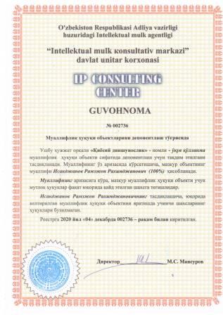 | 7447 | №002741 | Дарслик - "FARMATSEVTIK KIMYO" (I-II qism) | Юнусходжаев Ахматходжа Нигманович (25%), Убайдуллаев Кудратилла Асадуллаевич (25%), Юнусходжаева Нодира Абдулхамитовна (25%), Хусаинова Райхона Ашрафовна (25%) | Юнусходжаев Ахматходжа Нигманович, Убайдуллаев Кудратилла Асадуллаевич, Юнусходжаева Нодира Абдулхамитовна, Хусаинова Райхона Ашрафовна | 12/07/2020 | ![]() |