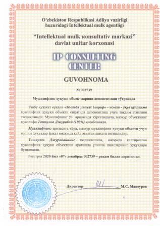| 7449 | №002739 | Ўқув қўлланма - "Islomda jinoyat huquqi" | Ташкулов Джурабай (100%) | Ташкулов Джурабай | 12/07/2020 | ![]() |