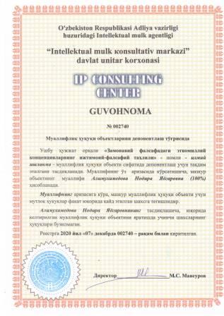 | 7448 | №002740 | Илмий ишланма - "Замонавий фалсафадаги этномиллий концепцияларнинг ижтимоий-фалсафий таҳлили" | Алимухамедова Нодира Ядгаровна (100%) | Алимухамедова Нодира Ядгаровна | 12/07/2020 | ![]() |