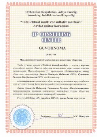 | 7445 | №002743 | Дарслик - "Tibbiyot tovarshunosligi" | Зияева Мавжуда Набиевна (50%), Султанова Гулнора Абилджановна (50%) | Зияева Мавжуда Набиевна, Султанова Гулнора Абилджановна | 12/07/2020 | ![]() |
