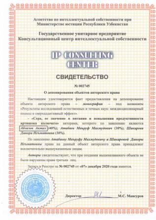 | 7443 | №002745 | Монография - "Результаты исследований естественных и точных наук: междисциплинарный подход и сверхаддитивный эффект: Сера, ее значение в питании и повышении продуктивности артишока колючего" | Абзалов Акмал (40%), Атабаев Маъруф Махмудович (30%), Шакирова Динора Неъматовна (30%) | Атабаев Маъруф Махмудович, Шакирова Динора Неъматовна | 12/07/2020 | ![]() |