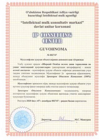| 7441 | №002747 | Илмий ишланма - "Шарқий Осиёда ислом дини тарқалиши ва унинг минтақавий хусусиятлари" (диссертация автореферати) | Эрназаров Одилжон Камилевич (100%) | Эрназаров Одилжон Камилевич | 12/07/2020 | ![]() |