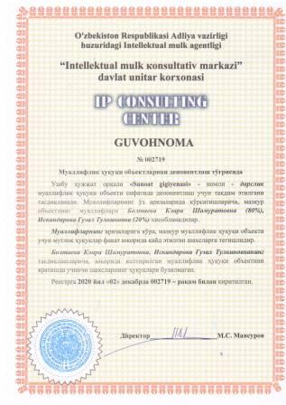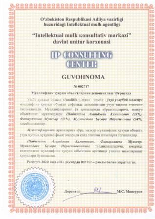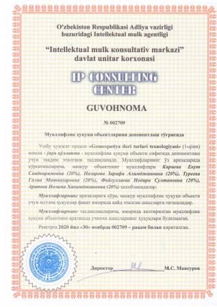 | 7469 | №002719 | Дарслик - "Sanoat gigiyenasi" | Болтаева Клара Шамуратовна (80%), Искандарова Гузал Тулкиновна (20%) | Болтаева Клара Шамуратовна, Искандарова Гузал Тулкиновна | 12/02/2020 | ![]() |
