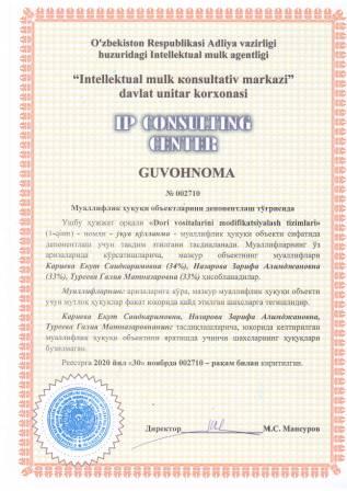 | 7478 | №002710 | Ўқув қўлланма - "Dori vositalarini modifikatsiyalash tizimlari" (1-qism) | Кариева Екут Саидкаримовна (34%), Назарова Зарифа Алимджановна (33%), Туреева Галия Матназаровна (33%) | Кариева Екут Саидкаримовна, Назарова Зарифа Алимджановна, Туреева Галия Матназаровна | 11/30/2020 | ![]() |