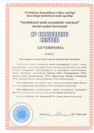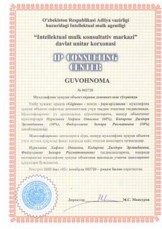 | 7468 | №002720 | Ўқув қўлланма - "Gigiena" | Нуралиева Хафиза Отаевна (60%), Кадирова Дилдора Эргашбаевна (30%), Файзуллаева Замира Рахматовна (10%) | Нуралиева Хафиза Отаевна, Кадирова Дилдора Эргашбаевна, Файзуллаева Замира Рахматовна | 12/02/2020 | ![]() |
