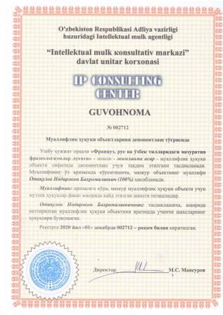 | 7476 | №002712 | Жамланма асар - "Француз, рус ва ўзбек тилларидаги мезуратив фразеологизмлар луғати" | Отақулов Нодиржон Бахромалиевич (100%) | Отақулов Нодиржон Бахромалиевич | 12/01/2020 | ![]() |