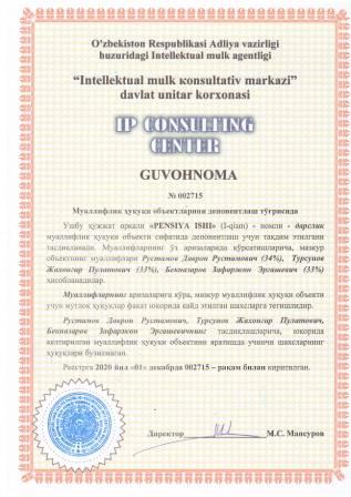 | 7473 | №002715 | Дарслик - "PENSIYA ISHI" (I-qism) | Рустамов Даврон Рустамович (34%), Турсунов Жахонгир Пулатович (33%), Бекназаров Зафаржон Эргашевич (33%) | Рустамов Даврон Рустамович, Турсунов Жахонгир Пулатович, Бекназаров Зафаржон Эргашевич | 12/01/2020 | ![]() |
