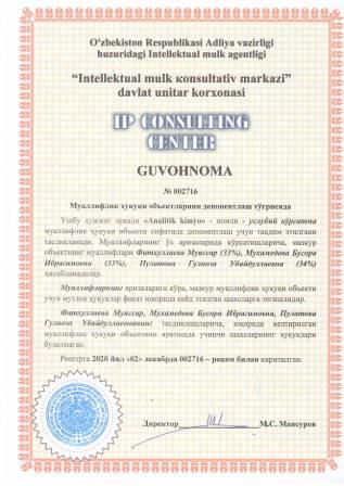 | 7471 | №002717 | Ўқув-услубий мажмуа - "Analitik kimyo" | Шабилалов Азатджан Ахматович (33%), Фатхуллаева Муяссар (33%), Мухамедова Бусора Ибрагимовна (34%) | Шабилалов Азатджан Ахматович, Фатхуллаева Муяссар, Мухамедова Бусора Ибрагимовна | 12/02/2020 | ![]() |
