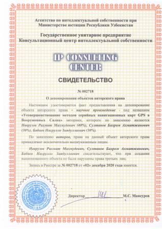 | 7470 | №002718 | Научное произведение - "Усовершенствование методов серийных навигационных карт GPS в Вооруженных Силах" | Наврузов Рахмат Махмудович (40%), Султанов Бахром Ахматжанович (30%), Бабаев Насрулло Зиядуллаевич (30%) | Наврузов Рахмат Махмудович, Султанов Бахром Ахматжанович, Бабаев Насрулло Зиядуллаевич | 12/02/2020 | ![]() |
