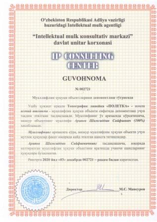 | 7467 | №002721 | Илмий ишланма - Топографик линейка "ПОЛЕТКА" | Арипов Шамсиддин Сайфиевич (100%) | Арипов Шамсиддин Сайфиевич | 12/03/2020 | ![]() |