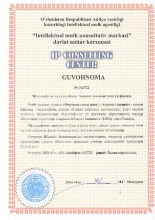 | 7466 | №002722 | Дарслик - "Фармацевтика ишини ташкил қилиш" | Умарова Шахноз Зиятовна (100%) | Умарова Шахноз Зиятовна | 12/03/2020 | ![]() |