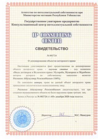 | 7464 | №002724 | Научная статья – "Виды договоров в Исламском праве: Музораба, Мушорака и Муробаха" | Рахманов Абдумухтор Режжаббаевич (100%) | Рахманов Абдумухтор Режжаббаевич | 12/03/2020 | ![]() |