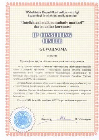 | 7461 | №002727 | Услубий қўлланма - "Оилавий муносабатлар психодиагностикаси" | Ғайибова Наргиза Анорбаевна (100%) | Ғайибова Наргиза Анорбаевна | 12/03/2020 | ![]() |