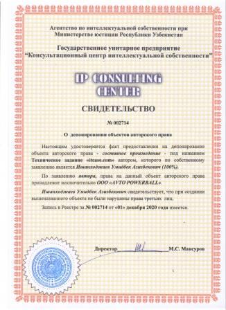 | 7474 | №002714 | Составное произведение - Техническое задание "itcase.com" | Ишанходжаев Умидбек Азизбекович (100%) | OOO "AVTO POWERBALL" | 12/01/2020 | ![]() |