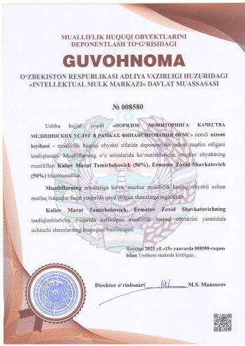 758 | №008580 | Nizom loyihasi –"ПОРЯДОК МОНИТОРИНГА КАЧЕСТВА МЕДИЦИНСКИХ УСЛУГ В РАМКАХ ФИНАНСИРОВАНИЯ ФГМС" | Kaliev Marat Temirbekovich (50%), Ermatov Zoxid Shavkatovich (50%) | Kaliev Marat Temirbekovich, Ermatov Zoxid Shavkatovich | 01/15/2025 | ![]() |