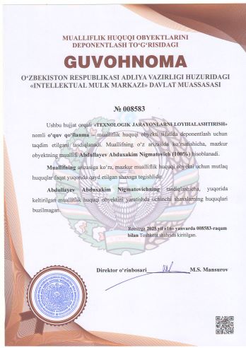 755 | №008583 | O‘quv qo‘llanma – "TEXNOLOGIK JARAYONLARNI LOYIHALASHTIRISH" | Abdullayev Abduxakim Nigmatovich (100%) | Abdullayev Abduxakim Nigmatovich | 01/16/2025 | ![]() |