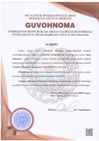 746 | №008592 | Ilmiy ishlanma – "MAXSUS FILTRLI DAMLAMALAR UCHUN TAYYORLANGAN CHOY VA KOFELI STAKANLAR" | Yusupov Ilhomjon Xatamjon o‘g‘li (100%) | Yusupov Ilhomjon Xatamjon o‘g‘li | 01/23/2025 | ![]() |