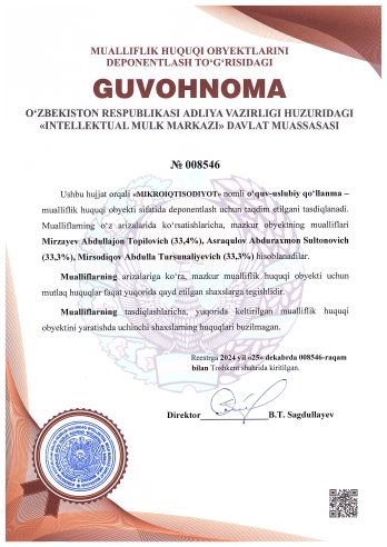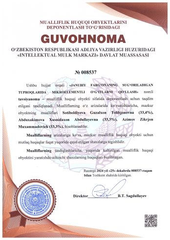 800 | №008537 | Tavsiyanoma –"JANUBIY FARG‘ONANING SUG‘ORILADIGAN TUPROQLARIDA MIKROELЕMЕNTLI O‘G‘ITLARNI QO‘LLASH" | Sotiboldiyeva Guzalxon Tolibjonovna (33,4%), Abduxakimova Xusnidaxon Abdullayevna (33,3%), Azimov Zikrjon Muxammadovich (33,3%) | FARG‘ONA DAVLAT UNIVERSITETI | 12/25/2024 | ![]() |