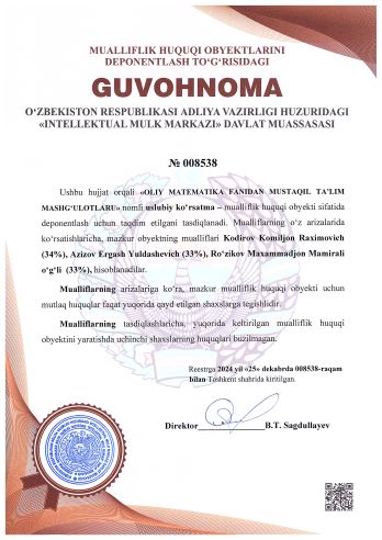 799 | №008538 | Uslubiy ko‘rsatma – "OLIY MATEMATIKA FANIDAN MUSTAQIL TA’LIM MASHG‘ULOTLARU" | Kodirov Komiljon Raximovich (34%), Azizov Ergash Yuldashevich (33%), Ro‘zikov Maxammadjon Mamirali o‘g‘li (33%) | FARG‘ONA DAVLAT UNIVERSITETI | 12/25/2024 | ![]() |