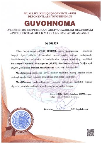 798 | №008539 | Monografiya –"SPORT TURIZMI" | Baltabayeva Maloxat Ortiqaliyevna (33,4%), Shaxbazova Gulrux Orifjon qizi (33,3%), Kulanova Darikul Asqarbekovna (33,3%) | FARG‘ONA DAVLAT UNIVERSITETI | 12/25/2024 | ![]() |