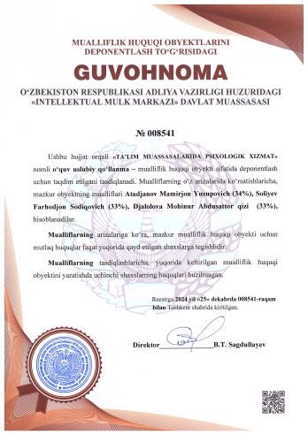 796 | №008541 | O’quv-uslubiy qo‘llanma– "TA’LIM MUASSASALARIDA PSIXOLOGIK XIZMAT" | Atadjanov Mamirjon Yusupovich (34%), Soliyev Farhodjon Sodiqovich (33%), Djalolova Mohinur Abdusattor qizi (33%) | FARG‘ONA DAVLAT UNIVERSITETI | 12/25/2024 | ![]() |
