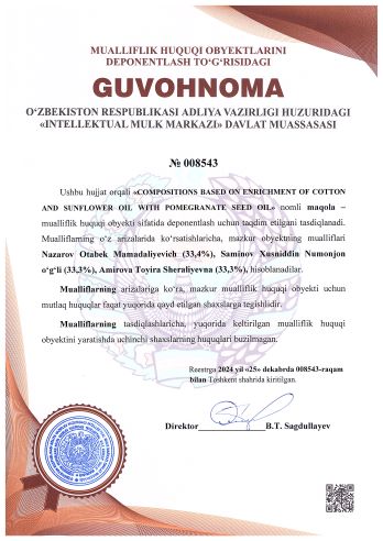 795 | №008543 | Maqola – "COMPOSITIONS BASED ON ENRICHMENT OF COTTON AND SUNFLOWER OIL WITH POMEGRANATE SEED OIL" | Nazarov Otabek Mamadaliyevich (33,4%), Saminov Xusniddin Numonjon o‘g‘li (33,3%), Amirova Toyira Sheraliyevna (33,3%) | FARG‘ONA DAVLAT UNIVERSITETI | 12/25/2024 | ![]() |