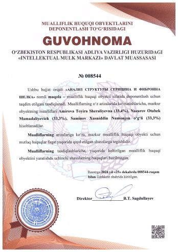 794 | №008544 | Maqola – "АНАЛИЗ СТРУКТУРЫ СЕРИЦИНА И ФИБРОИНА ШЕЛКА" | Amirova Toyira Sheraliyevna (33,4%), Nazarov Otabek Mamadaliyevich (33,3%), Saminov Xusniddin Numonjon o‘g‘li (33,3%) | FARG‘ONA DAVLAT UNIVERSITETI | 12/25/2024 | ![]() |
