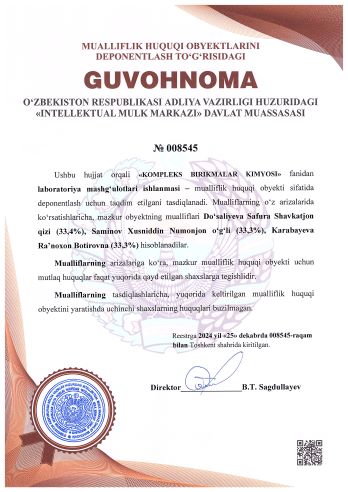 793 | №008545 | Laboratoriya mashg‘ulotlari ishlanmasi – "KOMPLEKS BIRIKMALAR KIMYOSI" | Do‘saliyeva Safura Shavkatjon qizi (33,4%), Saminov Xusniddin Numonjon o‘g‘li (33,3%), Karabayeva Ra’noxon Botirovna (33,3%) | FARG‘ONA DAVLAT UNIVERSITETI | 12/25/2024 | ![]() |