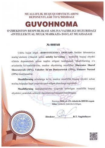 790 | №008548 | Uslubiy ko‘rsatma – "ROBOTOTEXNIKA ASOSLARI" | Shuxratov Sharof Shuxratovich (34%), Yakubov In’am Daniyarovich (33%), Yunusov Nurzod (33%) | FARG‘ONA DAVLAT UNIVERSITETI | 12/25/2024 | ![]() |