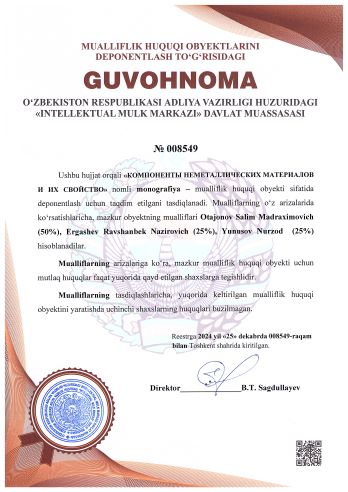 789 | №008549 | Monografiya –"КОМПОНЕНТЫ НЕМЕТАЛЛИЧЕСКИХ МАТЕРИАЛОВ И ИХ СВОЙСТВО" | Otajonov Salim Madraximovich (50%), Ergashev Ravshanbek Nazirovich (25%), Yunusov Nurzod (25%) | FARG‘ONA DAVLAT UNIVERSITETI | 12/25/2024 | ![]() |