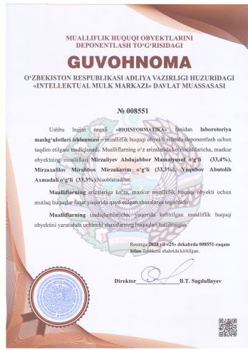 787 | №008551 | Laboratoriya mashg‘ulotlari ishlanmasi – "BIOINFORMATIKA" | Mirzaliyev Abdujabbor Mamatyusuf o‘g‘li (33,4%), Mirzaxalilov Mirabbos Mirzakarim o‘g‘li (33,3%), Yoqubov Abutolib Axmadali o‘g‘li (33,3%) | FARG‘ONA DAVLAT UNIVERSITETI | 12/25/2024 | ![]() |
