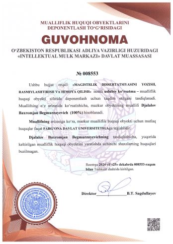 785 | №008553 | Uslubiy ko‘rsatma – "MAGISTRLIK DISSERTATSIYASINI YOZISH, RASMIYLASHTIRISH VA HIMOYA QILISH" | Djalalov Baxromjan Begmurzayevich (100%) | FARG‘ONA DAVLAT UNIVERSITETI | 12/25/2024 | ![]() |