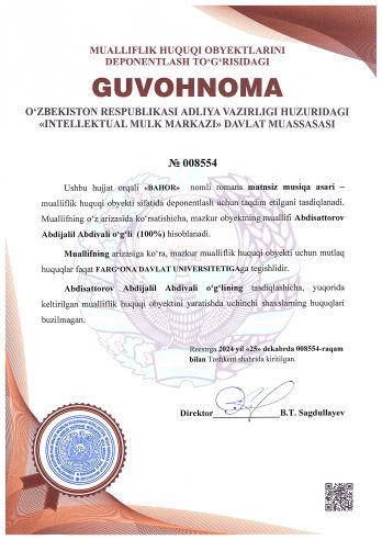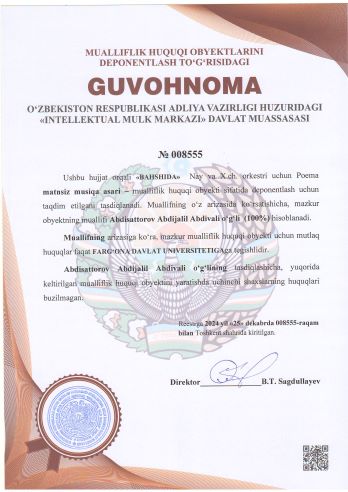 784 | №008554 | Matnsiz musiqa asari– "BAHOR" | Abdisattorov Abdijalil Abdivali o‘g‘li (100%) | FARG‘ONA DAVLAT UNIVERSITETI | 12/25/2024 | ![]() |