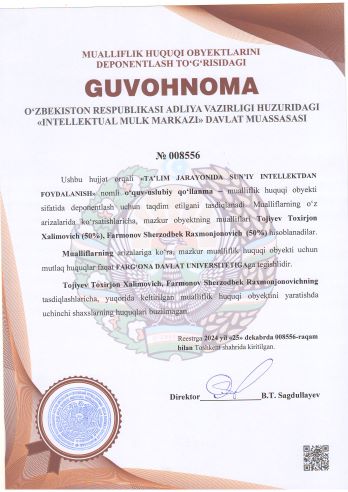 782 | №008556 | O’quv-uslubiy qo‘llanma– "TA’LIM JARAYONIDA SUN’IY INTELLEKTDAN FOYDALANISH" | Tojiyev Toxirjon Xalimovich (50%), Farmonov Sherzodbek Raxmonjonovich (50%) | FARG‘ONA DAVLAT UNIVERSITETI | 12/25/2024 | ![]() |