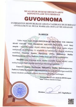 | 784 | №009328 | Ilmiy maqola – "MAIN PRINCIPLES OF TREATMENT FOR CHRONIC HEART FAILURE WITH PRESERVED EJECTION FRACTION" | Umarova Zamira Faxriyevna (34%), Maksudova Malika Xamdamjonovna (33%), Nadirova Yulduz Isom qizi (33%) | Umarova Zamira Faxriyevna, Maksudova Malika Xamdamjonovna, Nadirova Yulduz Isom qizi | 10/13/2025 | ![]() |