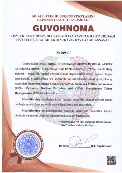 | 782 | №009330 | Ilmiy maqola – "ROLE OF OXIDATIVE STRESS IN RENAL ARTERY ATHEROSCLEROSIS: A CLINICAL AND EXPERIMENTAL STUDY" | Nazarova Nigina Otabek qizi (25%), Xasanova Malika Axramovna (25%), Raximova Gulsum Po‘Latboy qizi (25%) Madazimova Dilrux Hayotjonovna (25%) | Nazarova Nigina Otabek qizi, Xasanova Malika Axramovna, Raximova Gulsum Po‘Latboy qizi, Madazimova Dilrux Hayotjonovna | 10/13/2025 | ![]() |